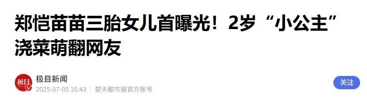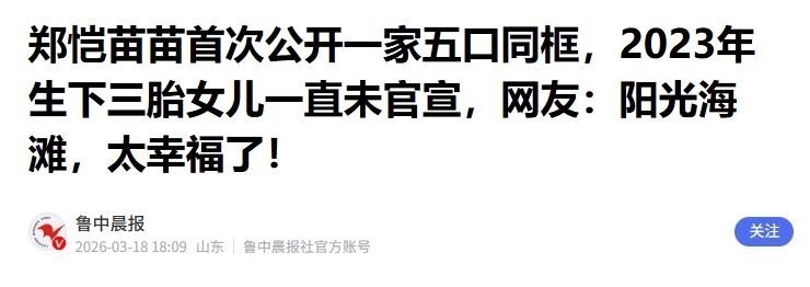 部分参考资料来源:鲁中晨报|郑恺苗苗首次公开一家五口同框,2023年生下三胎女儿一直未官宣,网友:阳光海滩,太幸福了!极目新闻|郑恺苗苗三胎女儿首曝光!2岁“小公主”浇菜萌翻网友